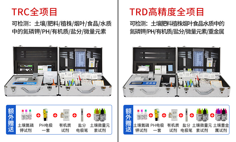 能夠檢測土壤及化肥、有機肥(含葉面肥、水溶肥、噴施肥等)、植株中的速效氮、速效磷、有效鉀、全氮、全磷、全鉀、有機質(zhì)、酸堿度,鈣、鎂、硫、鐵、錳、硼、鋅、銅、氯、硅、鉬等各種中微量元素以及鉛、鉻、鎘、汞、砷、鎳、鋁、氟、鈦、硒等各種重金屬含量。