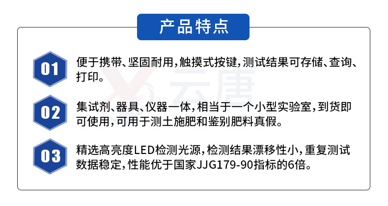配套齊全:該儀器集藥、器、儀為一體,攜帶方便,相當于一個小型實驗室。適于農(nóng)業(yè)服務部門或農(nóng)資經(jīng)銷商、肥料廠商測土施肥和鑒別肥料真假。