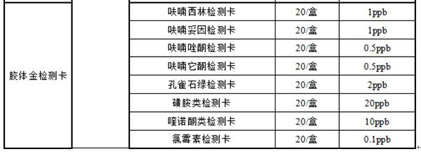 水產(chǎn)品的安全隱患主要是在養(yǎng)殖過程中藥物的過量使用及加工過程中添加劑的違規(guī)使用。食用水產(chǎn)品中對(duì)食品安全造成危害的藥物主要有:呋喃代謝物、四環(huán)素、環(huán)丙沙星等抗生素藥物殘留。公司針對(duì)市場上常見的水產(chǎn)品中藥物殘留開發(fā)對(duì)應(yīng)的檢測試劑盒及膠體金檢測卡如下表: