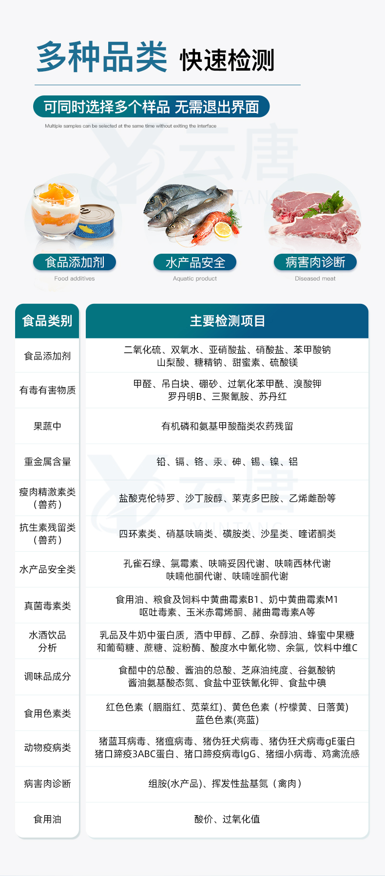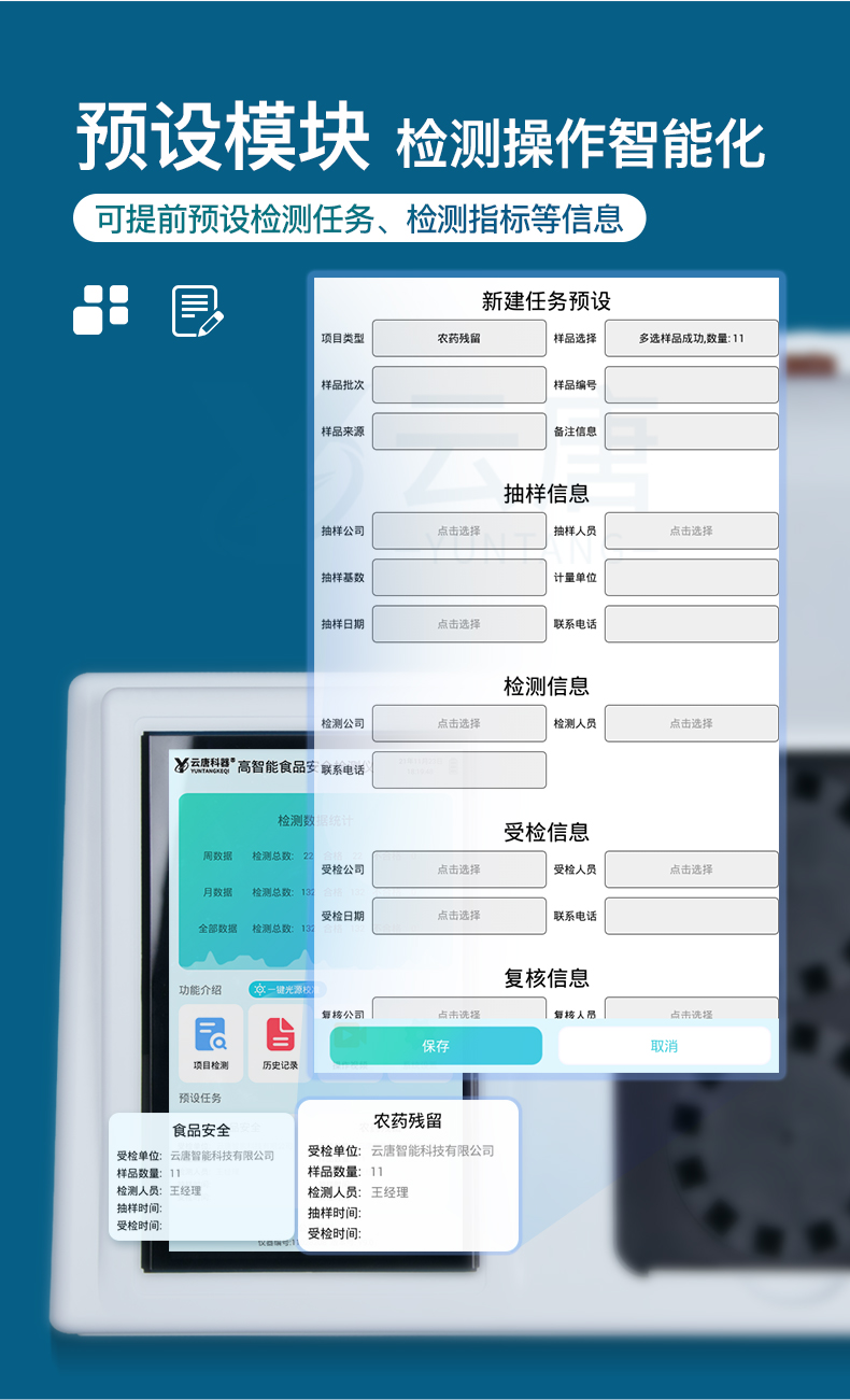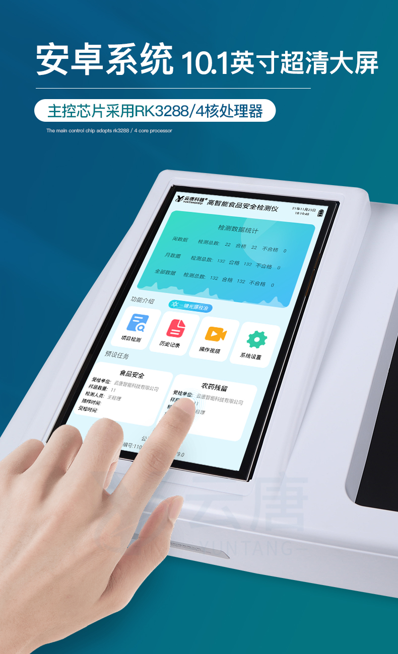 山東云唐智能科技有限公司生產(chǎn)的高智能食品安全檢測儀為集成化食品安全快速檢測分析設(shè)備,采用臺(tái)式一體化設(shè)計(jì),可快速檢測200多種食品安全項(xiàng)目,包含非食用化學(xué)物質(zhì)、濫用食品添加劑、農(nóng)藥殘留、獸藥殘留、重金屬、病害肉、營養(yǎng)強(qiáng)化劑、抗生素類殘留、激素類殘留、真菌毒素類殘留、化學(xué)類殘留等項(xiàng)目的定性定量檢測。