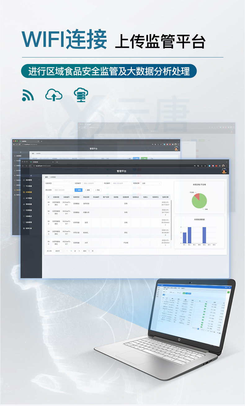 ★數(shù)據(jù)監(jiān)管系統(tǒng):同步對接監(jiān)管平臺(tái),數(shù)據(jù)可局域網(wǎng)和互聯(lián)網(wǎng)數(shù)據(jù)上傳,檢測結(jié)果可選擇直接傳至食品安全監(jiān)管平臺(tái)。進(jìn)行區(qū)域食品安全監(jiān)管及大數(shù)據(jù)分析處理與數(shù)據(jù)統(tǒng)計(jì),檢測區(qū)域食品安全長短期動(dòng)態(tài),達(dá)到食品安全問題預(yù)估、預(yù)警。(需提供對應(yīng)食品理化分析系統(tǒng)計(jì)算機(jī)軟件著作權(quán))。