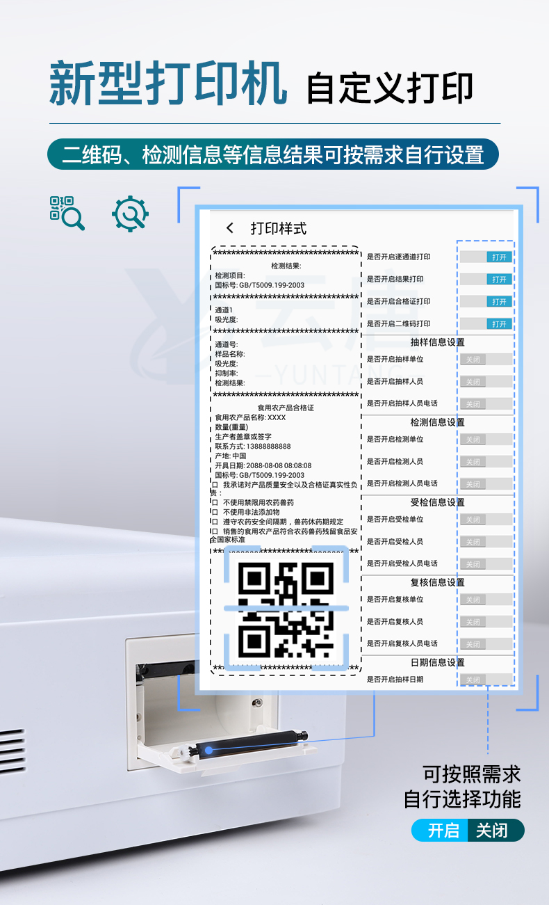 ★自定義打印系統(tǒng):內(nèi)置熱敏打印機(jī);系統(tǒng)打印格式多樣化,產(chǎn)品合格證(國家農(nóng)業(yè)部標(biāo)準(zhǔn)要求),二維碼,抽樣信息、檢測信息,受檢信息、復(fù)核信息、抽樣日期、檢測日期等信息結(jié)果,可按實(shí)際需求自行設(shè)置開啟或關(guān)閉,完成打印。(需提供對應(yīng)證明)
